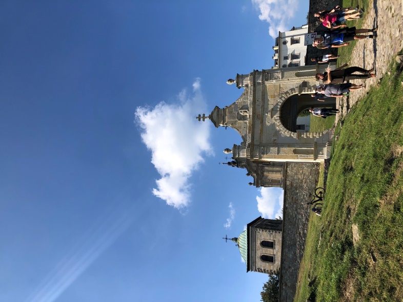 Po zdobyciu szczytu udaliśmy się do Bazyliki na Świętym Krzyżu oraz do sanktuarium Relikwii Drzewa Krzyża Świętego. Świątynia w stylu późnobarokowym została zbudowana w latach 1781 – 1789 wg projektu Józefa Karsznickiego w miejscu dwóch wcześniejszych kościołów. W 1914 roku wieżę zniszczono przez Austriaków, a następnie zrekonstruowano w 2014 roku z piaskowca. Wnętrze kościoła ma charakter klasyczny, miejscami zdobiony obrazami autorstwa Franciszka Smuglewicza. Do bazyliki przylega Kaplica Oleśnickich zwana Kaplicą Relikwii Krzyża Świętego powstała w latach 1614 – 1620 z funduszy Mikołaja Oleśnickiego. Od roku 1723 znajdują się w niej relikwie Krzyża Świętego. Zwiedzanie zespołu klasztornego zakończyliśmy na krypcie grobowej Jeremiego Wiśniowieckiego.